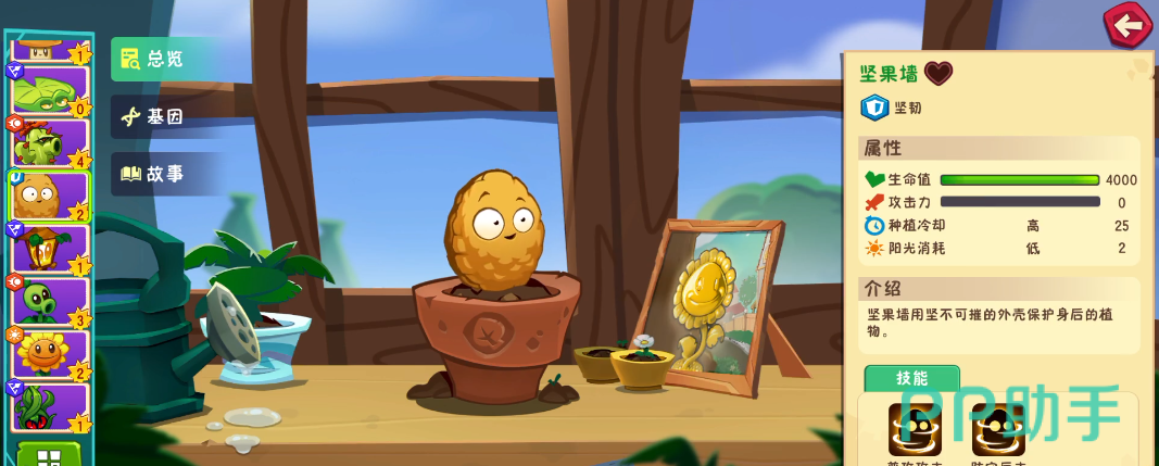 该植物的核心优势在于极高的生存能力,初始血量高达4000,常被部署在阵型最前端作为防御屏障。虽然不具备攻击能力,但能有效保护后排植物。“防守反击”技能可在激活后立即恢复全部生命值,并获得持续20秒的护盾,极大增强前线抗压能力,是构建稳固防线的关键单位。