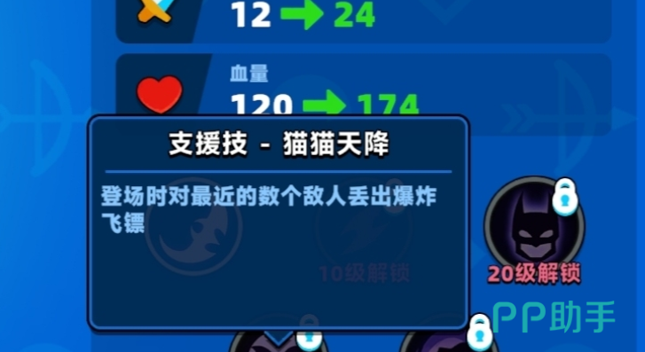 当角色成长至40级时,将激活名为“猫猫天将”的支援技。此技能可在战场投掷飞镖,造成范围性爆炸伤害,适用于清理密集敌人或压制敌方阵型。在PVP推图或面对群体目标时表现出色,能迅速削减对手生命值。而到了60级,则进一步解锁“爆炸飞镖”技能,进一步强化区域打击能力,使喵喵侠在团战中也具备极强的影响力。