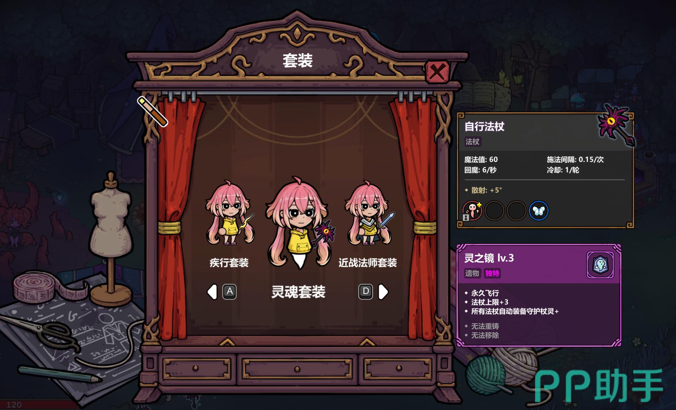 装备灵魂套装后,角色将获得专属武器“自行法杖”,初始自带3级“蝴蝶”飞弹技能,基础伤害为25点,飞行速度达到1.2m/s。套装核心遗物为“灵之镜”,提供三项增益:角色进入持续飞行状态、法杖携带上限额外+1(结合天赋可同时装备4根法杖)、所有法杖自动附加“守护杖灵+”效果。套装效果分为两个层级:穿戴3件时,蝴蝶飞弹数量由3提升至5,总伤害提高40%;集齐5件后,击杀敌人会触发范围为3米、造成50点伤害的灵魂爆炸,冷却时间为8秒。后者在清理密集小怪时表现突出,建议后期尽量达成满套配置。