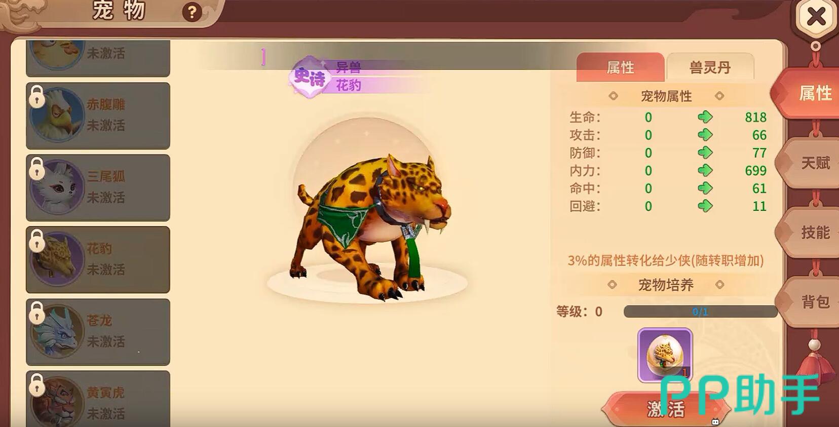 龙猫、赤腹雕、花豹和黄寅虎为游戏中四大主力宠物,整体强度位列T0梯队,品质随种类递增。其中,花豹的"致命链接"天赋可使单体输出职业获得群体伤害加成效果,而黄寅虎的"战意威慑"则能削弱敌方单位的攻击力。宠物可通过参与战斗或使用升级丹进行等级提升,随着等级成长,生命值、攻击能力与防御数值均会同步增强。完成转生操作后,还可进一步强化其专属天赋等级,从而提升特殊技能的实际效益。