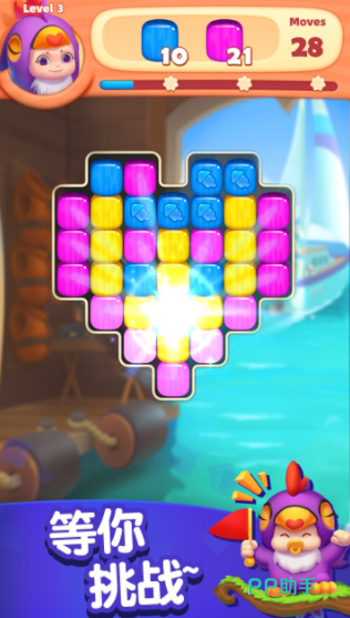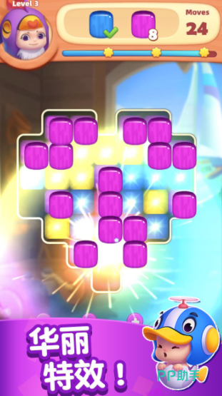 除了常规的三消模式外,游戏还引入了角色救援主题的特殊关卡。在此类挑战中,玩家需通过消除方块逐步解救被困的角色,每一步都需要提前规划策略以应对有限的行动次数。尽管存在一定的难度提升,但整体操作依然直观流畅,配合丰富的视觉特效,带来轻松愉悦的游戏体验。
