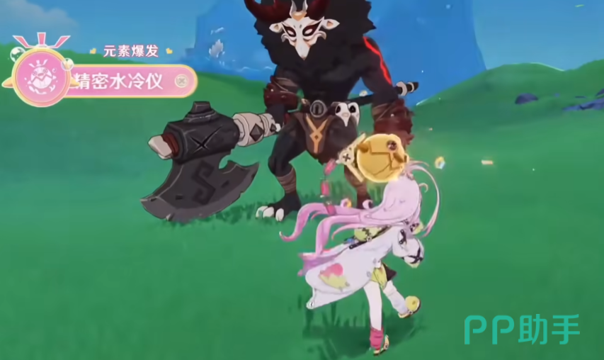 元素战技为“精密水冷仪”,使用后可投掷出名为“冷静一下鸭”的特殊装置。该装置会在指定区域展开一个持续运作的喷水机关,周期性发射水弹,对范围内的敌人施加水元素伤害。此召唤物可持续提供后台挂水支持,是触发反应的关键手段之一。