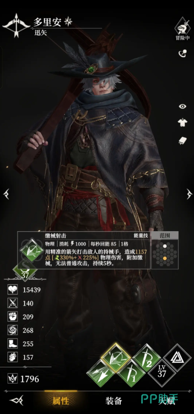 迅矢·多里安常被称为“男弓”,是贯穿游戏前后期的核心远程输出角色,尤其擅长对抗单体强敌。他的“射击”技能稳定输出物理伤害,“缴械射击”不仅能打出高额伤害,还会附加5秒缴械效果,使目标无法进行普通攻击。“穿甲箭”可在攻击时降低敌人10%护甲,若面对近战单位则效果翻倍,达到20%破甲。“地雷陷阱”会在战斗开始后于身前三格布置一枚隐藏地雷,触发后可对敌人造成相当于800%敏捷值的物理伤害,具备极强的爆发潜力。