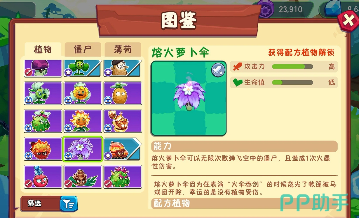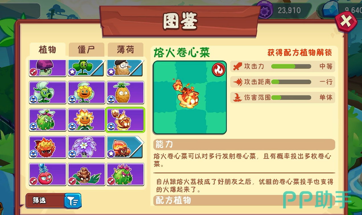 该植物由卷心菜投手和岩浆玉露融合而成,具备跨行打击能力,所投掷的卷心菜附带火焰燃烧效果,视觉冲击力强。在密集布阵时,多个熔火卷心菜可形成类似陨石连击的范围伤害场景。此外,其攻击过程中有一定几率触发多重投掷机制,一次性打击多个目标,显著提升清怪效率。