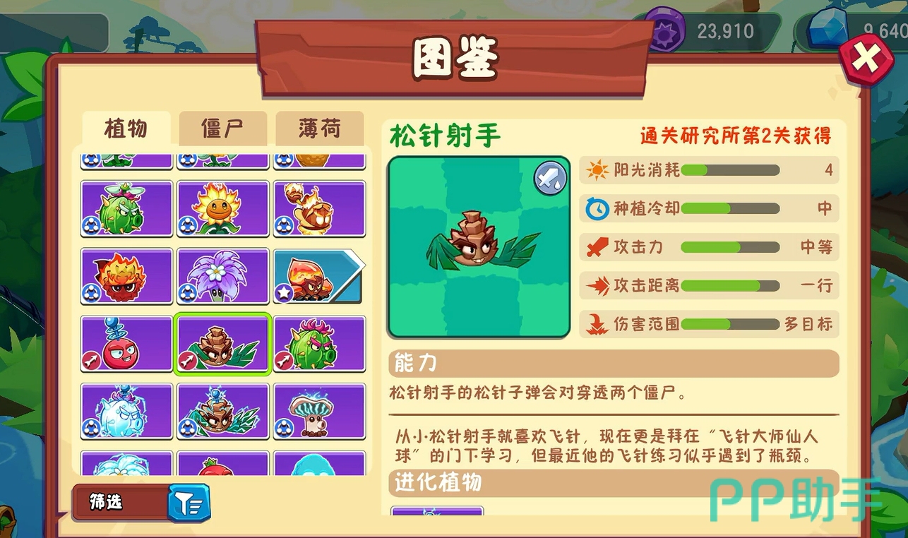 属于高投入高回报型紫色植物,阳光消耗较高,但拥有出色的穿透攻击能力。其所发射的松针可贯穿两名僵尸且伤害不衰减,适合应对成群推进的敌人阵容。若进一步与脉冲黄桃融合,还能转化为电能松针射手,附加连锁电击效果,进一步扩大群体压制优势。