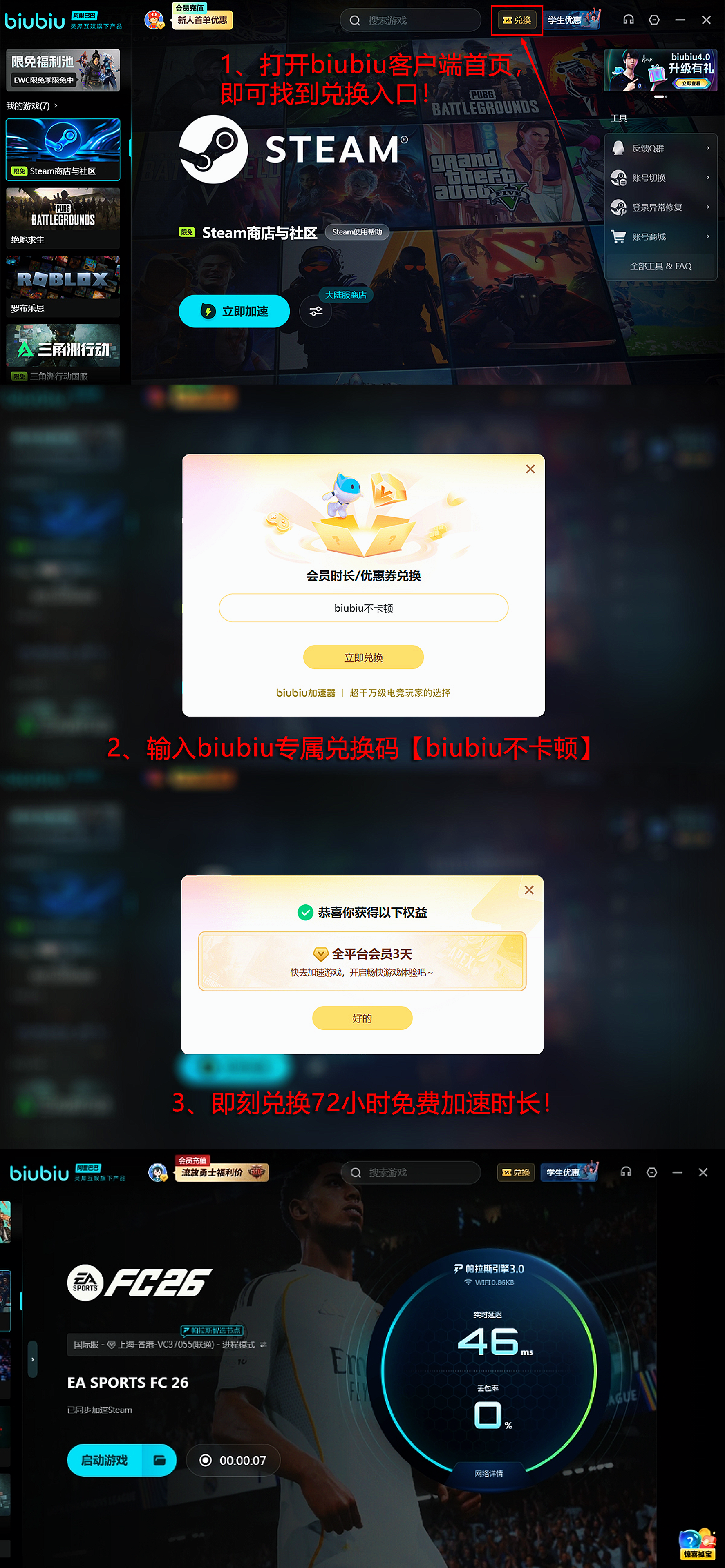 玩家们在完成任务的时候,基本上要参与这个赛季很多热门的赛事,比如联赛、杯赛等。如果没有良好的网络,比赛过程中很容易出现卡顿、延迟的问题,影响操作和比赛结果,这时就可以使用biubiu进行加速。其加速器联合冠军选手Aixleft打造的专属方案,引入帕拉斯引擎3.0,优化网络环境,减少延迟和卡顿,现在的biubiu可谓是迎来了重磅的升级,同时新人在注册后便能获得24小时免费加速时长,新老用户使用兑换码【biubiu不卡顿】还可额外获得3天免费的使用权。
