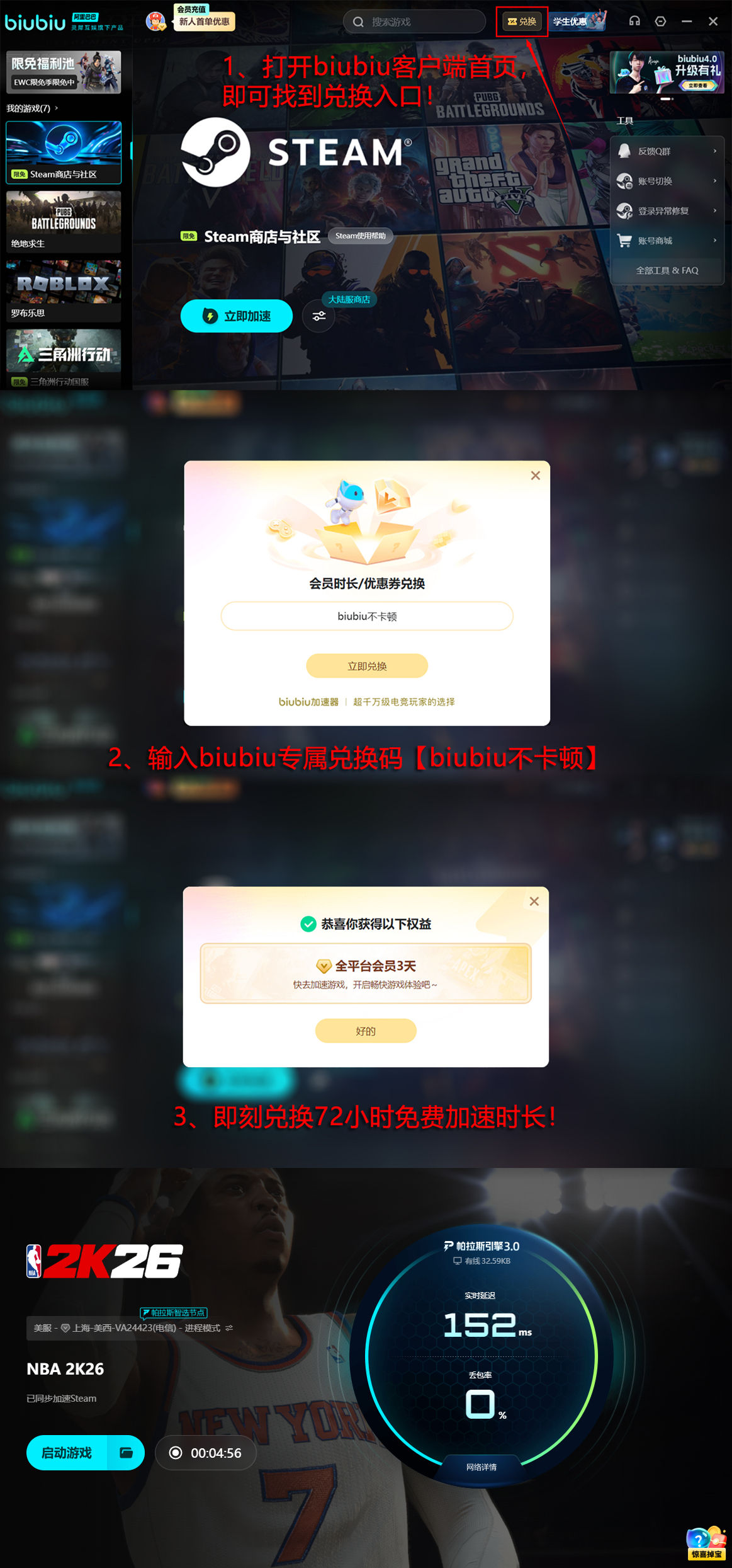 新用户注册 biubiu 加速器,就能先拿到 24 小时免费加速,畅玩游戏不卡顿!不仅如此,新老用户还可以使用兑换码【biubiu不卡顿】,直接领取3天免费加速时长,长期有效,无需担心过期。无论你是刚入坑的新玩家,还是老玩家,轻松畅玩游戏、告别卡顿,从此体验更顺畅的竞技乐趣!