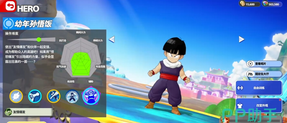 幼年孙悟饭别看个子小小机动性和辅助能力是比较强的,操作难度也较高,能够用友情爆发让队友和自己一起变强,还可以用愤怒爆发把隐藏起来的力量引出来。