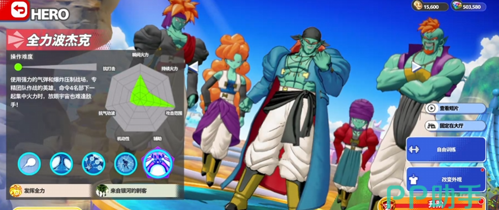 首先第一个分享的是孙悟空超级赛亚人,他的操作难度是比较低的,机动性很强,能够突袭到敌人的面前,然后贴身使用界王拳打击对方,此外还有元气弹和龟派神功等技能。