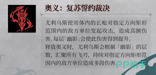 奥义技“复苏誓约裁决”则是尤利乌斯的终极杀招。释放时,他以长枪贯穿范围内所有敌人,造成大范围高额伤害。每拥有一层“幽影”,技能威力都将获得提升,同时飞刃的追加打击会在敌群中引发连锁反应,形成连续的高爆发输出。此技能兼具清场能力和压制后排的功能,能够在团战中迅速改变局势。