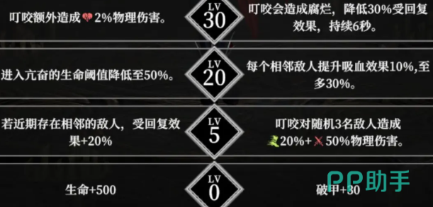 夜魅的天赋系统提供了多样化的成长路径。初始阶段即可获得30点破甲与500点生命值加成;5级时可激活两项增益:当有敌人位于相邻位置时,自身受到的治疗效果提升20%,同时“叮咬”变为对范围内随机三名敌人造成伤害;20级时可选择降低亢奋状态触发的生命阈值至50%,或根据相邻敌人数目每名提供10点吸血效果;30级时则可进一步增强“叮咬”,使其额外造成相当于目标2%最大生命值的物理伤害,或附加削弱效果——降低目标30%所受治疗效果,持续6秒。