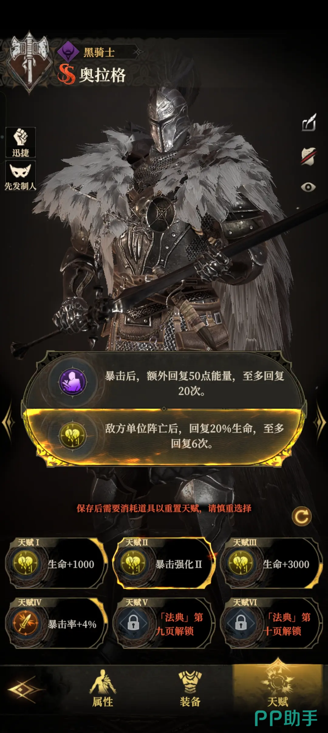 通过以上介绍,相信玩家们已经了解了地下城堡4黑骑士的核心机制与培养方向。尽管他是骑士职业出身,却拥有独特的隐身与突进能力,能够在战场上灵活穿梭,执行刺杀与收割任务。整体实力强劲,但需要一定的操作理解才能发挥全部潜力。