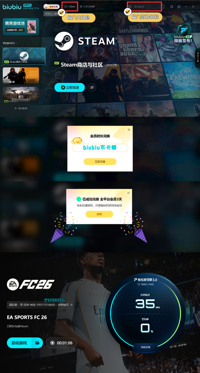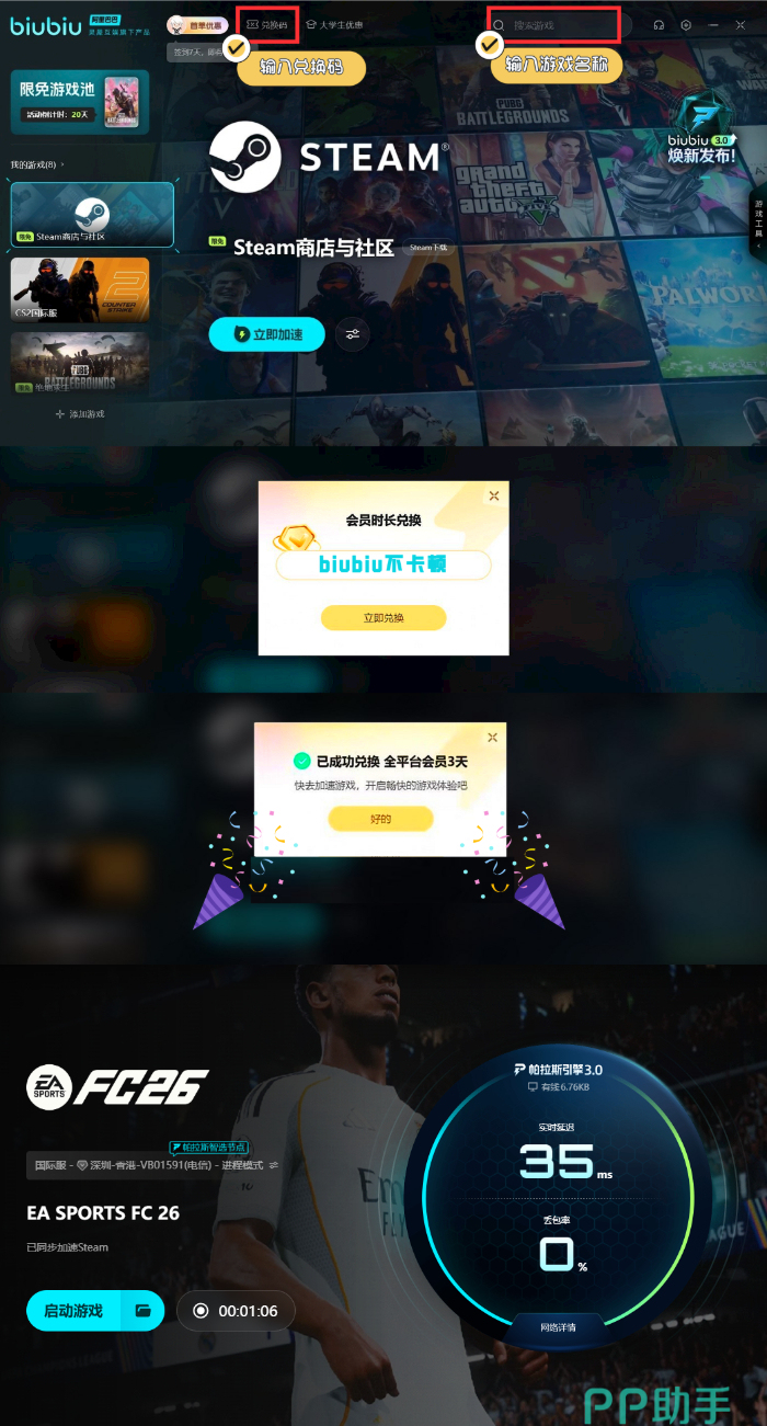 中场与后防线则以 “实用性” 为核心,年轻球员戴伟浚是中场亮点,后防线由蒋光太领衔。不过,当玩家用中国队参与联机对战,比如国际在线赛季或全球友谊赛时,由于服务器覆盖范围广,容易出现网络延迟问题。比如传球指令慢半拍导致丢球,射门时机偏差错过机会。这时 biubiu加速器就能提供有效助力,新用户注册即可获得24小时免费加速时长,无需绑定支付信息就能测试跨服连接效果,输入专属口令“biubiu 不卡顿”还能额外兑换72小时免费服务;其搭载的帕拉斯引擎3.0能动态优化网络传输路径,冠军选手Aixleft参与调校的足球专项参数,更针对射门响应、传球精度等关键操作做了优化,确保指令传输即时无延迟。