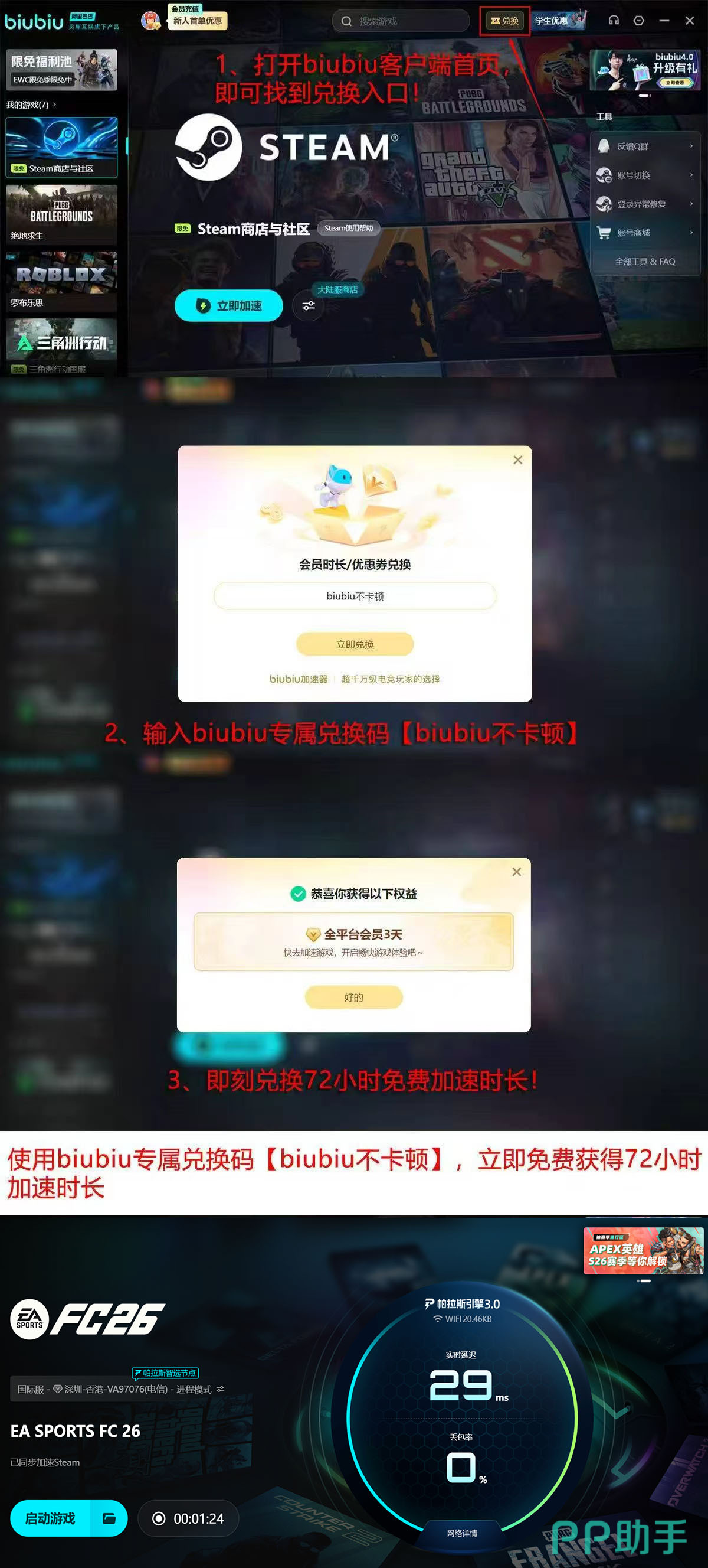 biubiu加速器采用极简设计理念,界面清晰易用,用户只需输入游戏名称即可一键开启加速,无需复杂设置,全程无广告干扰,保障纯净使用体验。加速期间,延迟值、丢包率等关键网络参数实时显示,帮助玩家清晰掌握当前网络质量,告别“是否因网络导致卡顿”的困扰。新用户注册后可享24小时免费试用权限,若需延长测试时间,输入专属口令【biubiu不卡顿】还可额外获得72小时加速时长,充分体验画质提升与操作响应增强带来的差异。这一设计极大降低了使用门槛,让每位玩家都能快速验证加速效果,在理想网络状态下享受丝滑 gameplay,随时随地投入精彩对局。