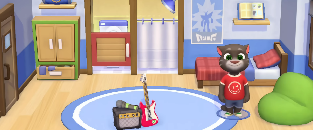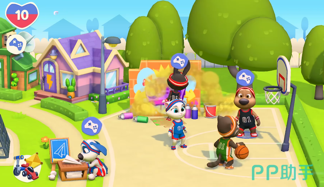 在玩法拓展方面,汤姆猫总动员2新增了多项趣味小游戏。主场景中的泳池不仅是角色放松的场所,还可触发互动彩蛋。若追求竞技乐趣,可邀请好友进行投篮比拼;偏好高速操作的玩家则能体验割草机竞速或滑板挑战模式,多元化的迷你游戏让日常养成更具变化性。