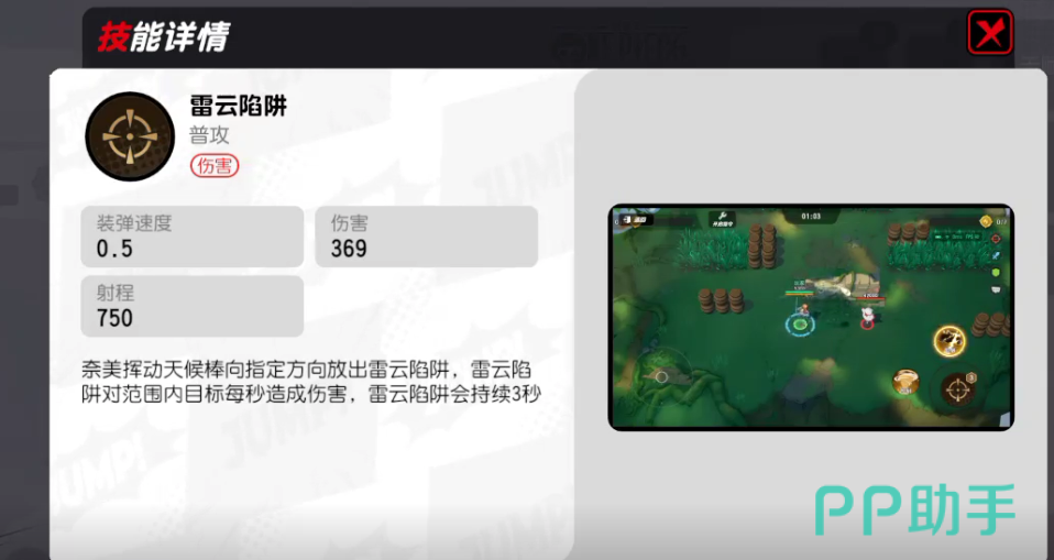 奈美的普通攻击名为“雷云陷阱”,她会利用天候棒向指定方向释放一个持续3秒的雷云区域,期间每秒对范围内敌人造成固定数值伤害,适合用于封锁走位或持续消耗对手血量。