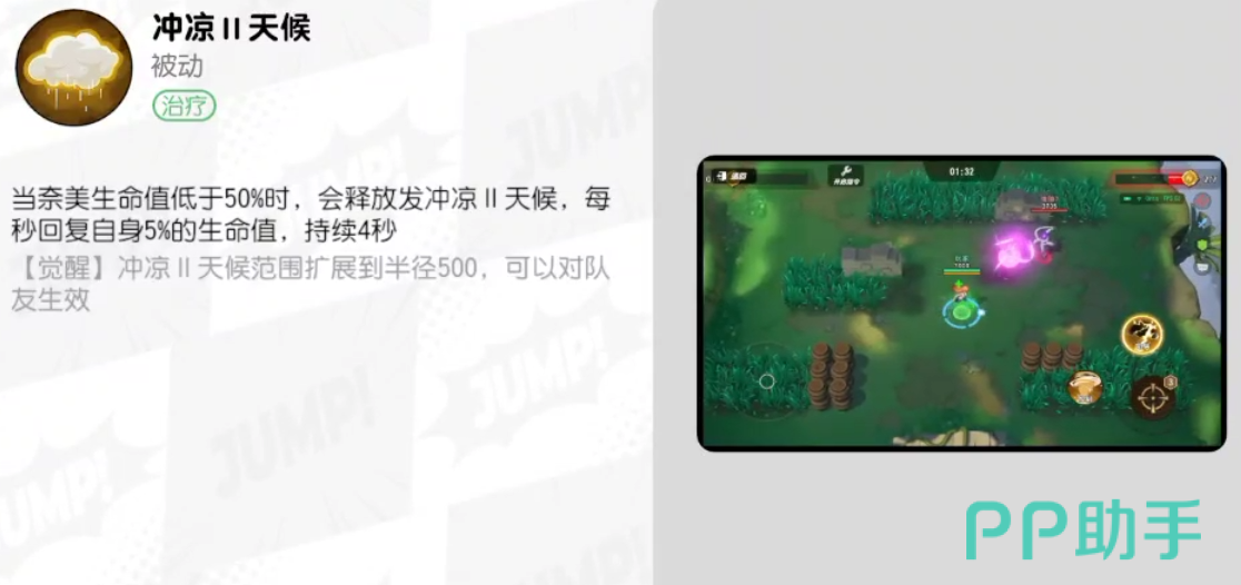 被动技能“冲凉”则提供了关键的生存保障——当奈美自身生命值低于50%时,会自动触发一个回复效果,每秒恢复5%的生命值,持续4秒。觉醒后此效果不仅范围扩大,还可惠及周围队友,实现群体续航,在持久战中具有重要战略意义。