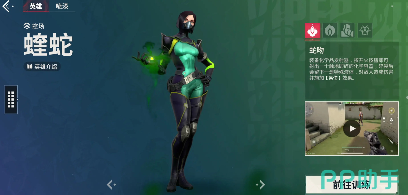 作为典型的控场型角色,蝰蛇精通使用各类毒气装置来限制敌方行动。她的技能组合可以封锁区域、遮挡视野,并对敌人造成持续伤害与负面状态。一技能投掷化学容器,落地后形成腐蚀区域,使触碰者受到伤害并附加易伤效果;二技能可通过地形部署雾墙喷射器,释放可重复使用的烟雾线路;三技能则生成一片持久的化学迷雾,阻碍视线。大招能够大范围释放毒气,削弱敌方视野的同时持续削减生命值。这些技能在攻防转换、残局分割等方面具有极高战略价值,是掌控战场节奏的重要人选。