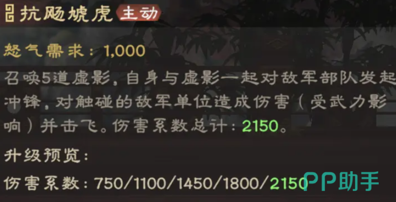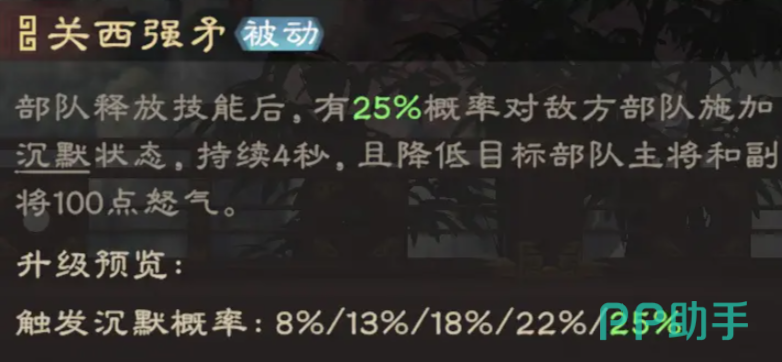 马超的怒气技能名为“抗飏虓虎”,可召唤五道虚影协同自身对敌军发起冲锋,攻击路径上的目标将受到连续伤害并被击飞。此技能覆盖范围广,兼具高额输出与控制效果,是其战场核心手段之一。被动技能“关西”则可在部队释放技能后,有25%概率使敌方陷入持续4秒的沉默状态。