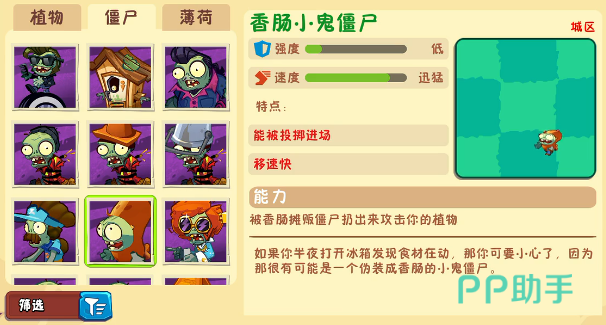 香肠小鬼僵尸拥有140点生命值和44的移速,其最大特点是随机换行的漂移行为,增加了预判和拦截难度。应对这类不规则移动目标,可使用大蒜喷射器改变其行进路线,或布置芭蕉叶制造强制位移陷阱,打乱其进攻节奏。