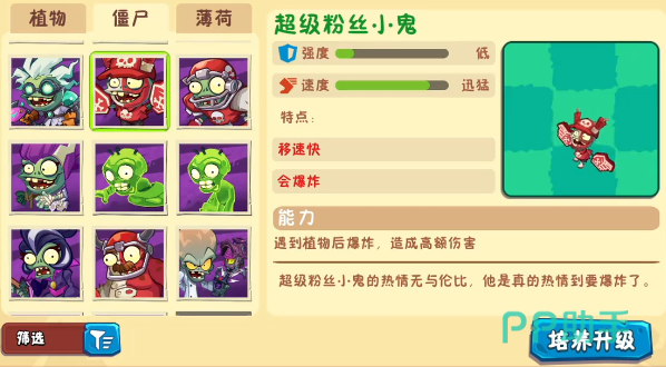 粉丝小鬼僵尸看似脆弱,仅有95点血量,却隐藏着极强的爆发力。它会主动冲向最近的植物并触发自爆,造成高达8000点的范围伤害,足以瞬间摧毁一整行的普通防御植物。由于其行为模式具有突发性,新手玩家极易措手不及。推荐在向日葵后方部署坚果墙作为第一道屏障,并在解锁寒冰菇后利用其减速效果控制冲锋节奏,再配合高射速植物进行远程压制。