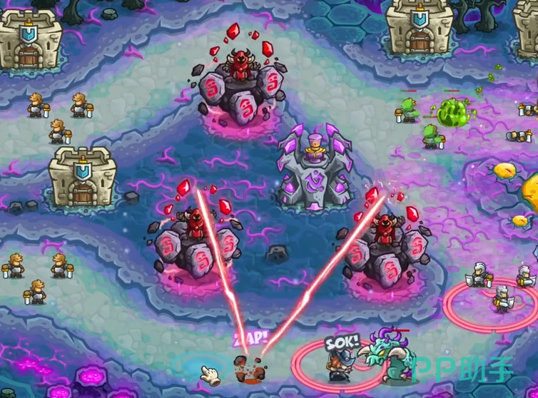 随着战斗进入中期,上方路径开始出现空中单位,这些敌人往往具备较高的机动性且常规物理塔难以锁定。因此在后半段区域建议优先建造法术类防御塔,例如闪电法师或火焰祭坛,这类单位对飞行目标具备天然克制效果,能够高效清除漏网之敌。