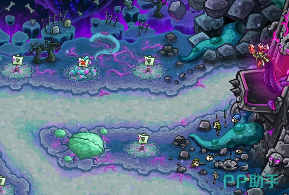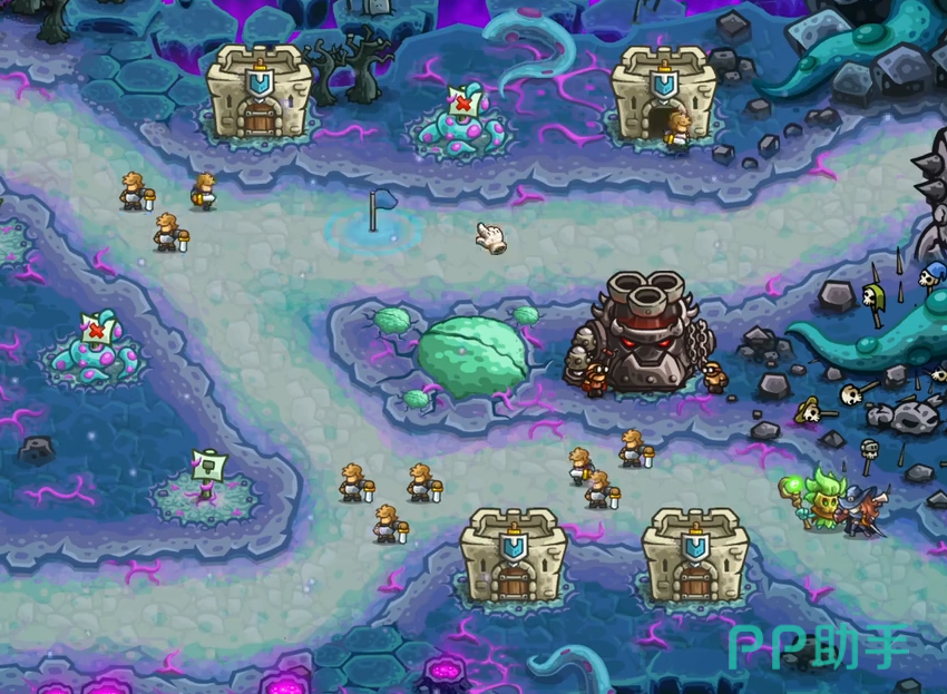 开局后,在剧情结束阶段应立即将英雄部署至下方恶魔之塔入口前方的关键点位,用于拦截首批地面单位并承担承伤任务。紧接着,在左侧路径中部建造一座加农炮,利用其范围伤害特性有效打击密集推进的敌军群体。该塔建成后应优先进行升级,以确保输出能力跟上敌军强度增长。
