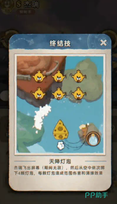 其终结技名为“天降灯泡”,释放时角色将短暂飞出画面范围,期间处于无敌状态。随后四颗巨型灯泡从高空依次坠落,每次落地均触发范围爆炸,并附带清空敌方弹幕的效果,有效提升生存空间。