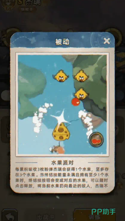 被动技能方面,杰瑞每收集三颗粉弹即可获得一个水果,最多可储存三个。当终结技未充能完成且持有水果时,技能按钮将变为水果图标:樱桃(50%概率)激活后提供2倍特技伤害,苹果(30%概率)可使普通攻击造成3倍输出,西瓜(20%概率)则带来高达4倍的爆发伤害。