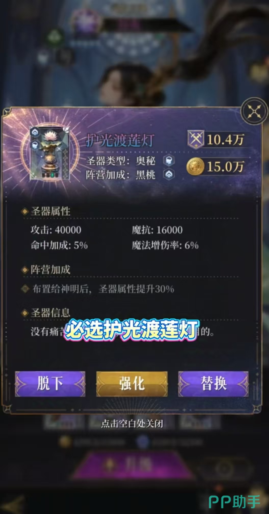 圣器配置上,攻击类圣器首选护光渡莲灯,提供命中率与法术伤害加成,是质变输出的核心装备;防御向圣器建议装配显像归壤甲,增强生存能力,避免被集火秒杀;其余两件可根据实际战斗需求灵活选择搭配方案。