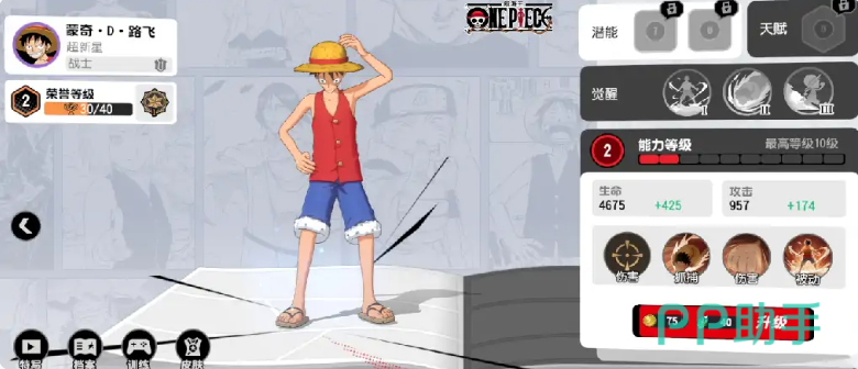 路飞凭借其标志性的橡胶能力构建了高度灵活的战斗体系。小技能“伸长手臂”允许他向指定方向快速突进,无论是追击残血目标还是脱离危险区域都极为高效。大招“橡胶巨人拳击”以矩形区域释放高额爆发伤害,虽然使用后角色体型会暂时缩小,但带来的输出收益远超负面状态。该角色兼具机动性与输出稳定性,既能充当队伍前排开团先锋,也可在侧翼寻找机会分割敌阵。技能设计忠实还原动漫设定,操作逻辑清晰直观,非常适合刚接触此类游戏的新手玩家逐步建立战斗意识。