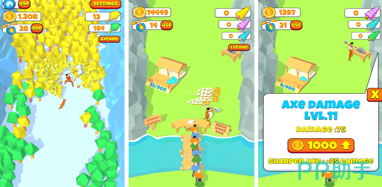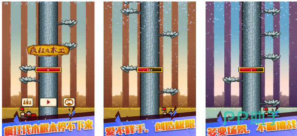 在本作中玩家将化身为疯狂伐木工,在森林中不断砍伐树木,通过快速点击屏幕提升砍伐效率。像素风格背景色彩鲜明,辨识度高。电锯、斧头等专用工具支持升级强化,游戏进程流畅,能直观感受到成长带来的速度飞跃,带来畅快解压的互动体验。