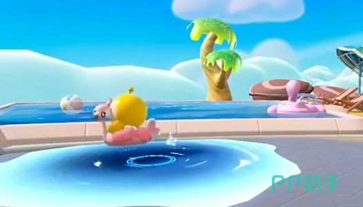 除了战斗表现亮眼,甜甜雀的互动动作也极具趣味性。它可以化身成泳圈,载着小蛋仔在水面缓缓漂游;也能在陆地上翩翩起舞,演绎一段优雅的华尔兹。当情绪激动时,它会用喙轻啄蛋仔表达不满,或是散步途中突然察觉异常,迅速转身逃离现场,生动展现了它俏皮又敏感的性格特征。