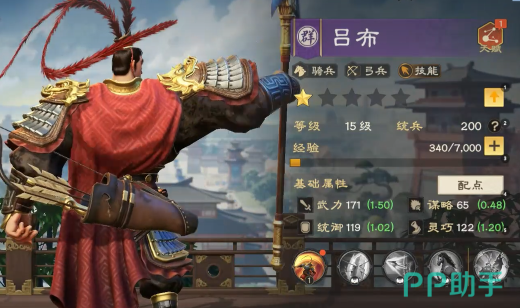 从基础属性来看,吕布拥有高达1.5的武力成长值,这一数值在整个武将体系中位居前列,使其在持续输出方面具备天然优势。无论是前期压制还是后期收割,他都能稳定承担主力输出角色。同时,其统御成长也表现不俗,赋予了他在前排站稳脚跟的能力,能够在承受伤害的同时为后排创造输出空间。