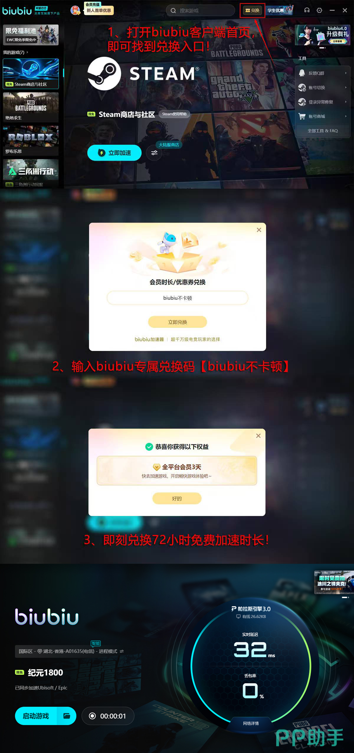 在持续提升技术性能的同时,biubiu加速器还携手电竞冠军Aixleft进行深度合作,从用户体验角度优化产品逻辑。官方近期推出多项福利活动,新用户注册即可领取24小时免费时长,所有会员还可通过首页【biubiu不卡顿】兑换72小时加速权益,参与多个活动后总时长最高可达96小时,助力玩家无忧畅玩。