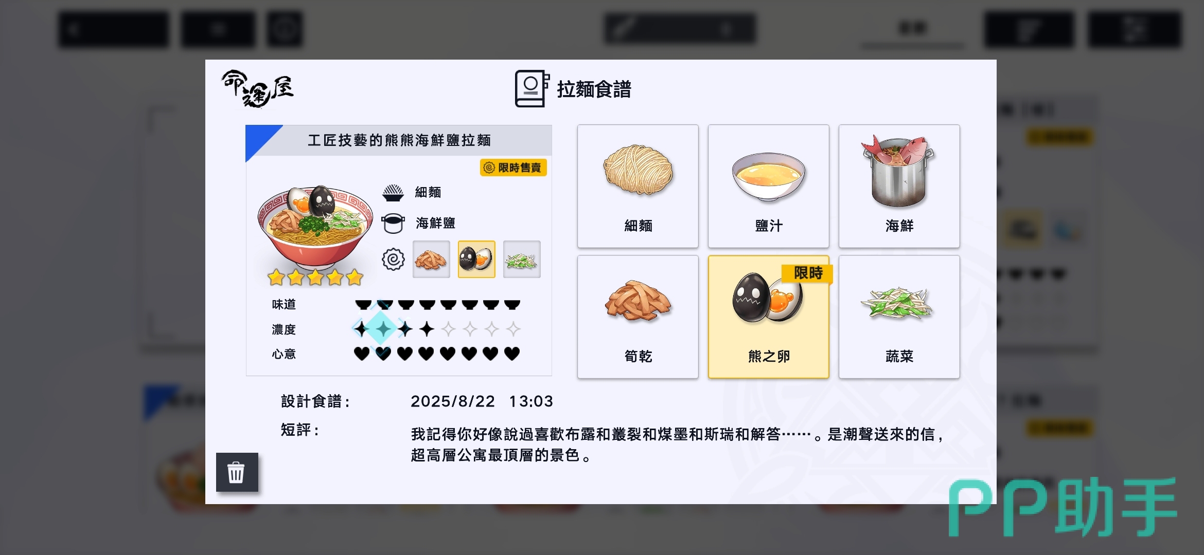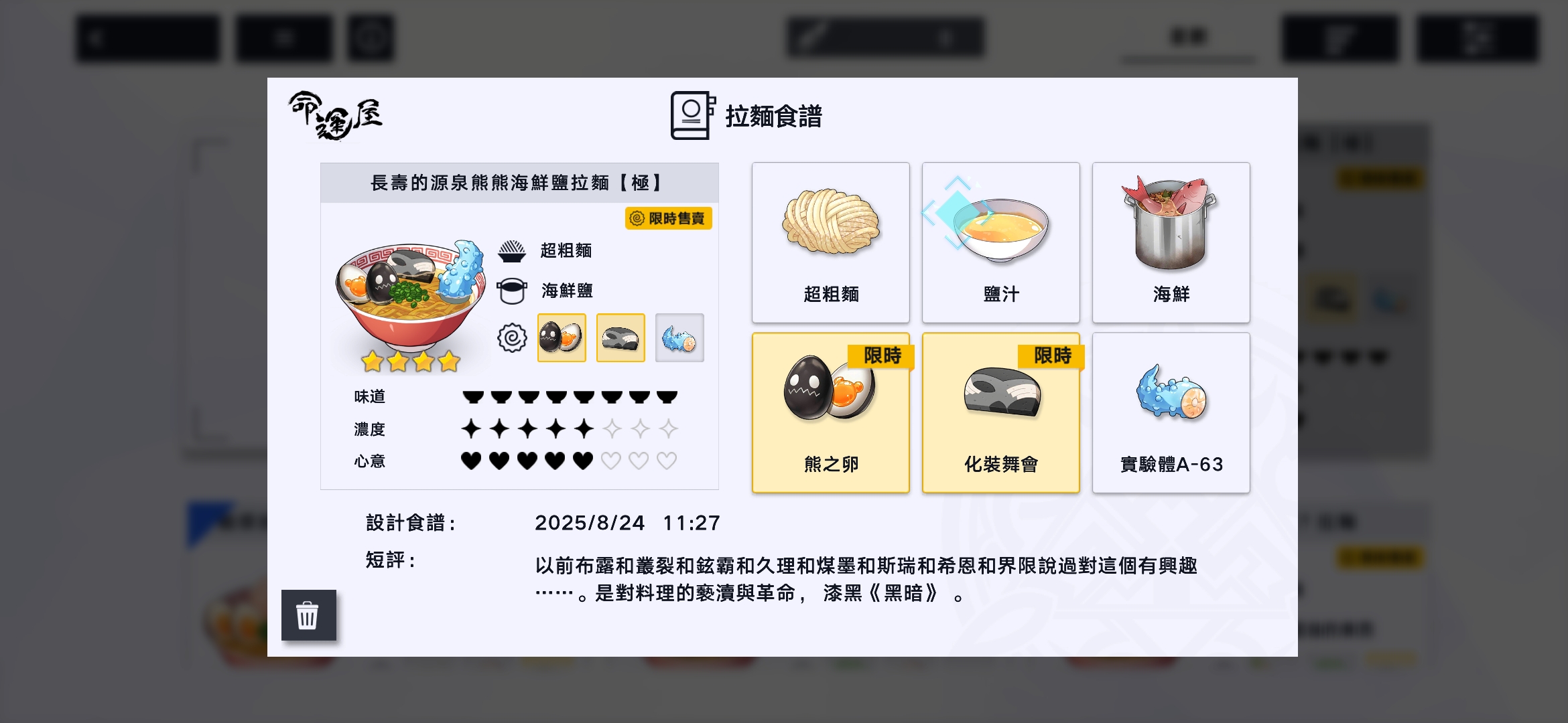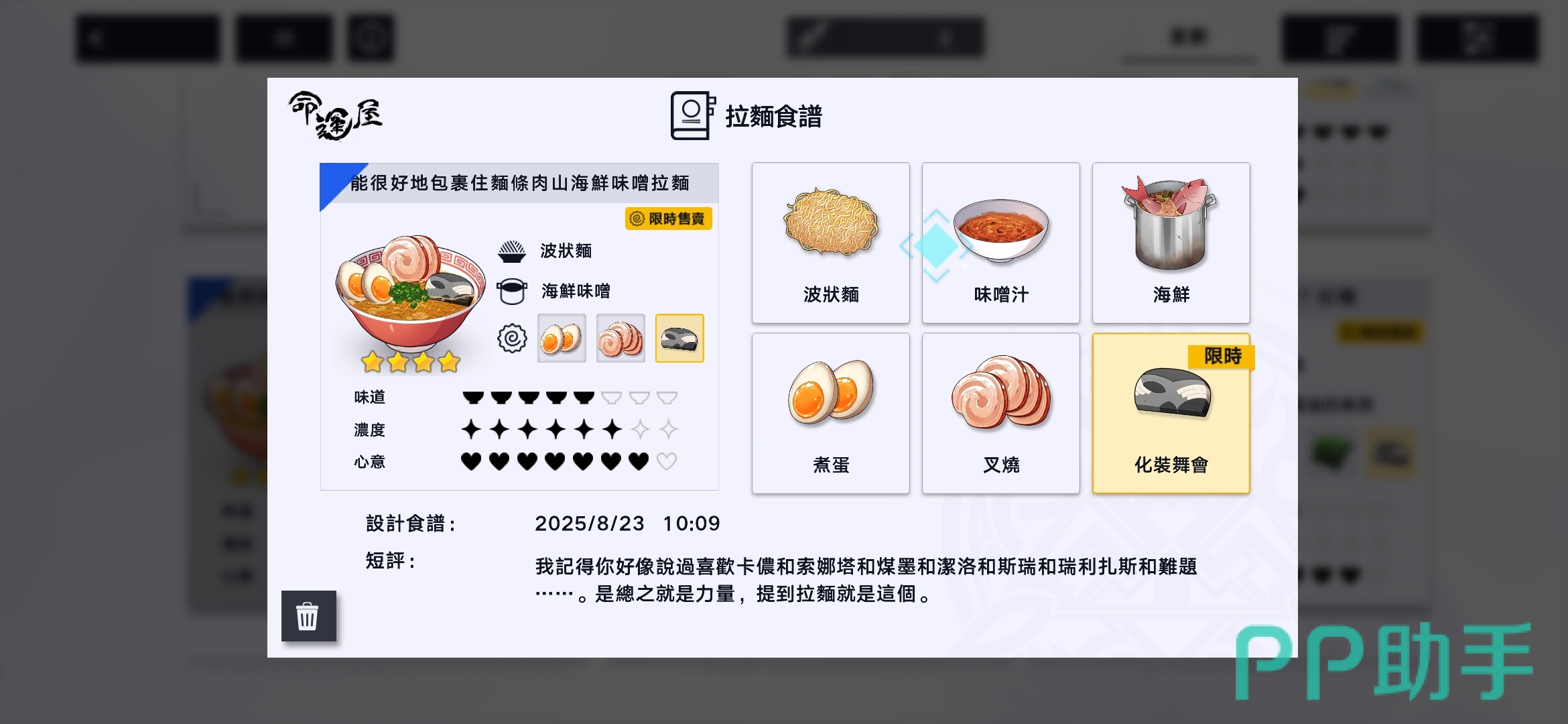 影响拉面屋收益的核心因素有两个:一是所制作拉面的系统评分,二是是否贴合当天的流行趋势。若当日菜单恰好匹配流行食材组合,销售回报将大幅提升。因此,在每日流行榜单刷新后,及时调整菜单,上架符合趋势的高分料理,是维持高效率经营的关键策略。此外,不同骑士对口味有各自偏好,提供他们喜爱的拉面不仅能增加来访频率,更有助于快速积累信赖度。