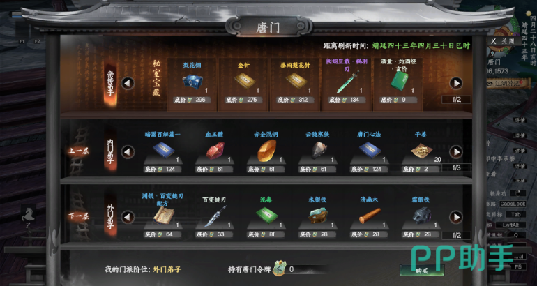 作为专精暗器的门派,唐门拥有多项标志性武学,如暴雨梨花针、金针等。当玩家晋升为亲传弟子后,便可在贡献堂使用门派贡献兑换这些独门武技与心法。掌握后能显著增强角色输出与实战能力,因此尽早完成晋升对整体发展极为关键。