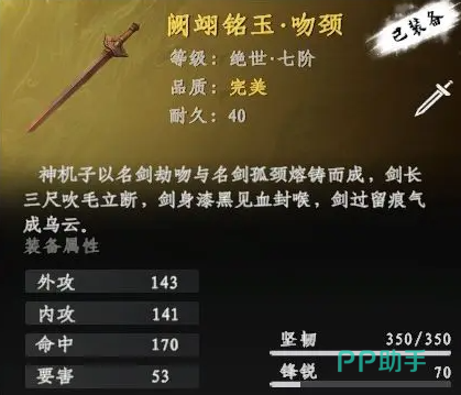 第一种方式是通过完成特定探索任务来获取。以“吻颈”这件武器为例,玩家需先将悟性提升至110点,随后前往将军墓区域开启相关剧情。此时墓穴尚无法直接进入,必须先前往法华村的杂货铺(坐标1026,-38)购买燃香并点燃,之后根据任务提示前往1018,-54处与一位老者对话,推进任务进程。