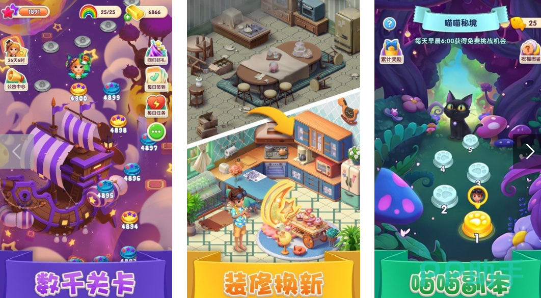 本作采用清新可爱的美术风格,场景涵盖极地雪原、海上战舰以及鲜花盛开的田园等。玩家可通过直线、十字或同色匹配的方式完成消除任务,并解锁新地图与喵喵副本。与传统滑动操作不同,《宾果消消乐》加入了策略预判机制,需要提前思考后续走法以达成最优解。