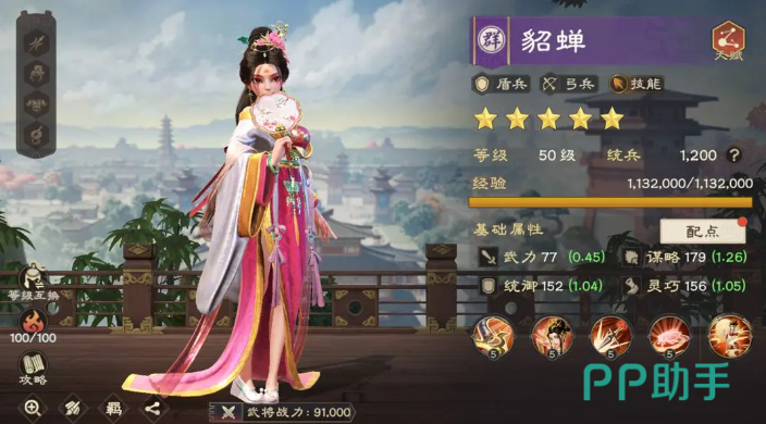 貂蝉定位为强力辅助型武将,能够有效提升队伍的整体输出效率与稳定性。她的怒气技为前方向三次挥鞭,每次命中均造成伤害并附加击飞效果,三段控制可打断敌方关键技能释放,起到良好的压制作用;