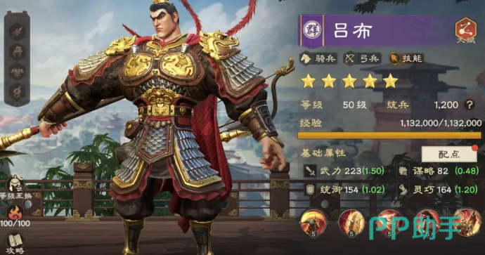 被动技能方面,“雄桀叱咤”能提升骑兵与弓兵的攻击力,结合自身高额武力成长,显著强化部队整体输出;“辕门射戟”提高全队技能暴击率,增强瞬间爆发力;“马中赤兔”则进一步提升技能伤害并降低所受反震伤害,觉醒后还可增加部队技能伤害,全面补强战斗表现。