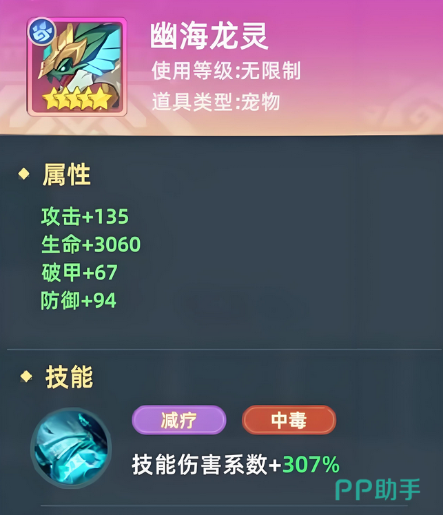 凭借禁疗与持续掉血的组合机制,幽海龙灵成为对抗回复型阵容的绝佳选择。特别值得注意的是,它在PVP场景下对玩家单位造成的伤害提升至1.5倍,升星后还能进一步增强输出能力。因此,该宠物被广泛应用于竞技场等玩家对抗环境中,擅长通过削弱敌方续航能力来建立战斗优势。