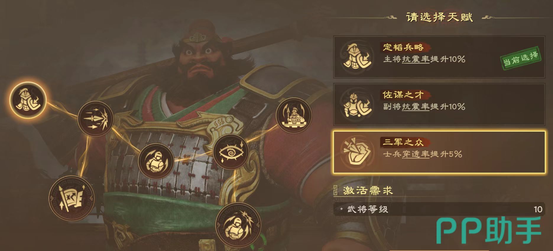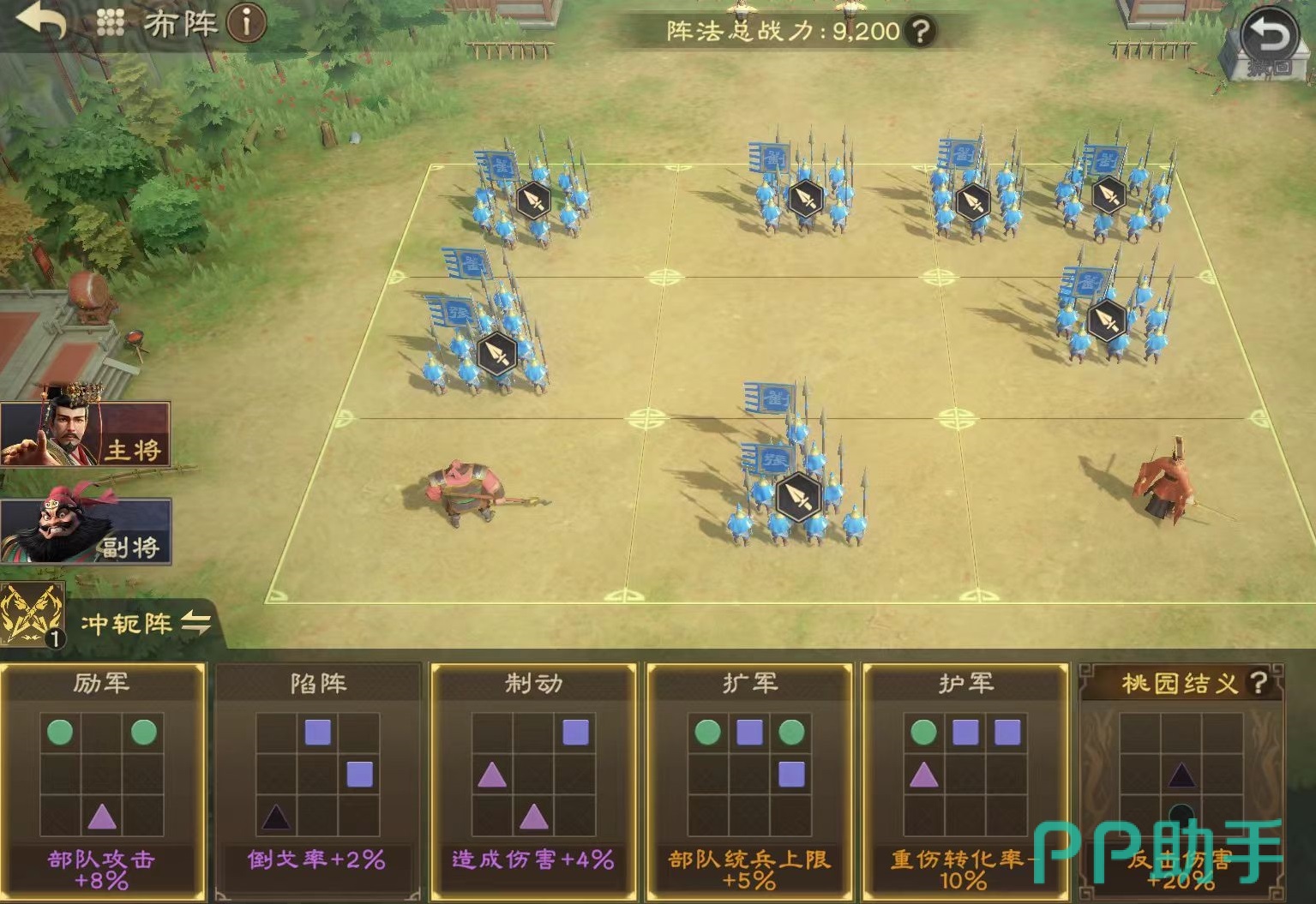 其主动技能可实现位移打击,造成范围伤害并触发击退效果,结合高额武力成长,输出表现稳定。被动方面,在部队释放技能后有机会激活激战状态,最高叠加三层,提升反击伤害、反击率与反震率,使张飞在承受普攻或技能攻击时均能有效反制。觉醒后,受到技能伤害还有概率为全队提供治疗支持,显著增强持久作战能力。推荐阵法首选冲轭阵,该阵法专为强化反击体系设计,可大幅提升队伍的反击频率与伤害输出,特别克制依赖普通攻击的阵容。阵型配置建议优先选择扩军、护军、制动与励军。若暂未获得冲轭阵,可用鹤翼阵作为替代方案,维持基础反伤结构。
