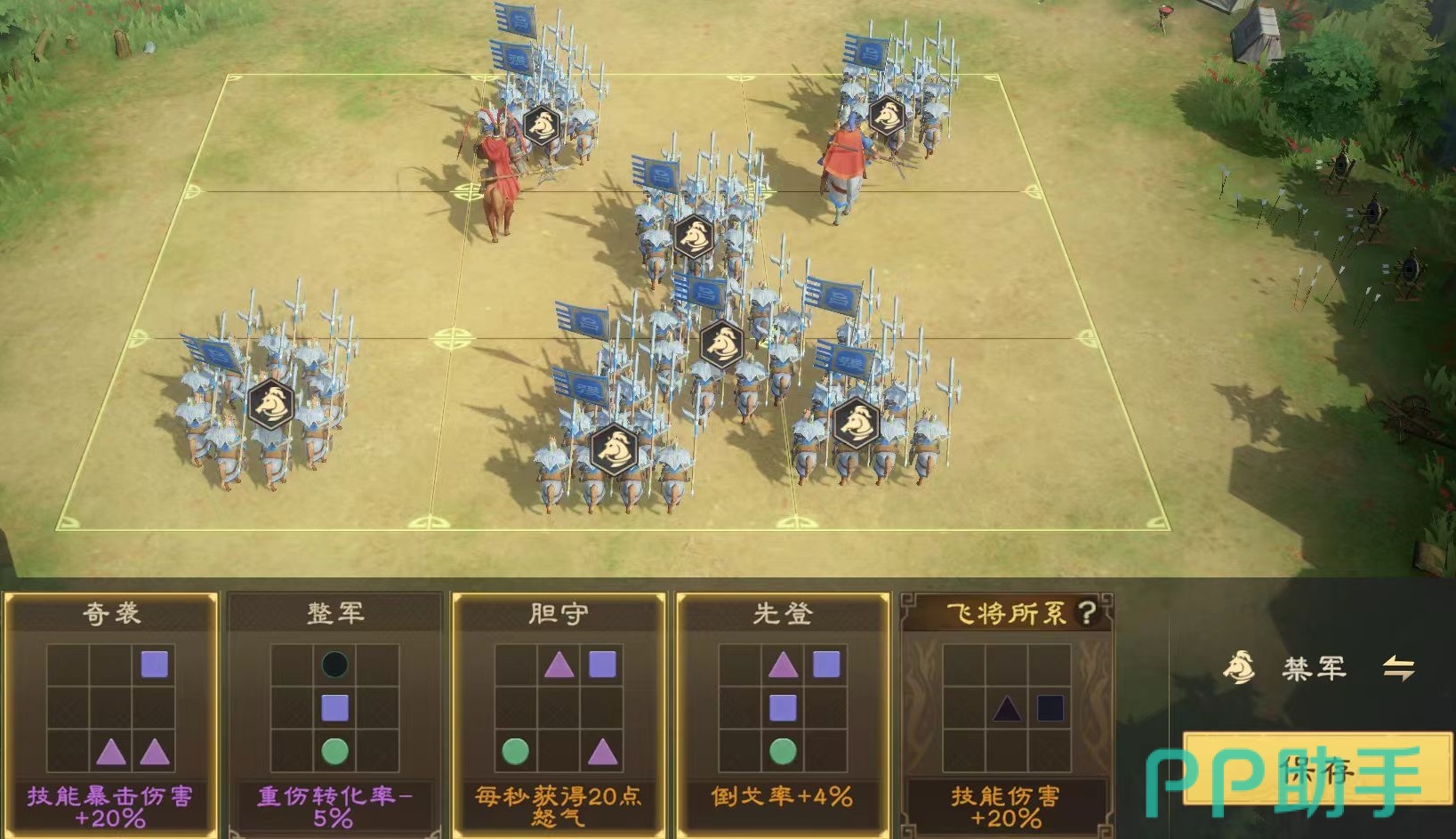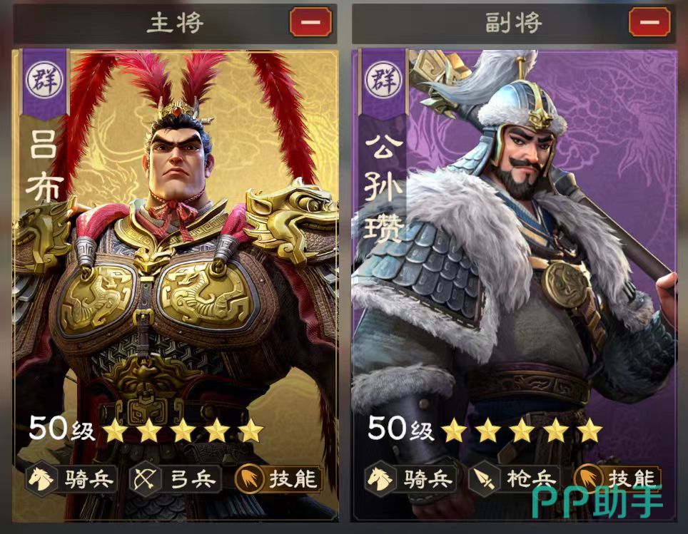 第二套推荐阵容采用吕布与公孙瓒组合,兵种选用禁军,阵法仍为双龙阵。公孙瓒虽为紫色品质武将,但其被动可提升全队技能伤害与暴击概率,怒气技同样带有击退效果,与吕布技能形成良好联动。该阵容成型门槛低,适合前期推图开荒使用,待后期资源充足后可逐步替换为貂蝉完成阵容升级。