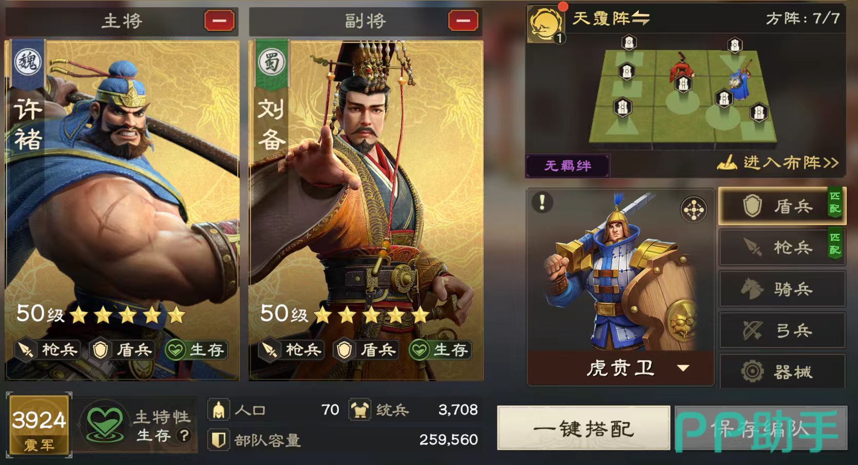 结合上述特色兵种与可选武将,玩家可以构建多种战术风格的盾兵队伍。推荐第一种搭配为“生存型盾阵”,主将选用许褚,副将搭配刘备,兵种配置为虎贲卫,阵法采用天覆阵。此组合在游戏首赛季表现尤为突出。许褚的技能可显著提高队伍抗性,刘备则具备降低普攻暴击与技能暴击伤害的能力,两者协同大幅提升整体防御强度,有效克制依赖爆发输出的敌方阵容。