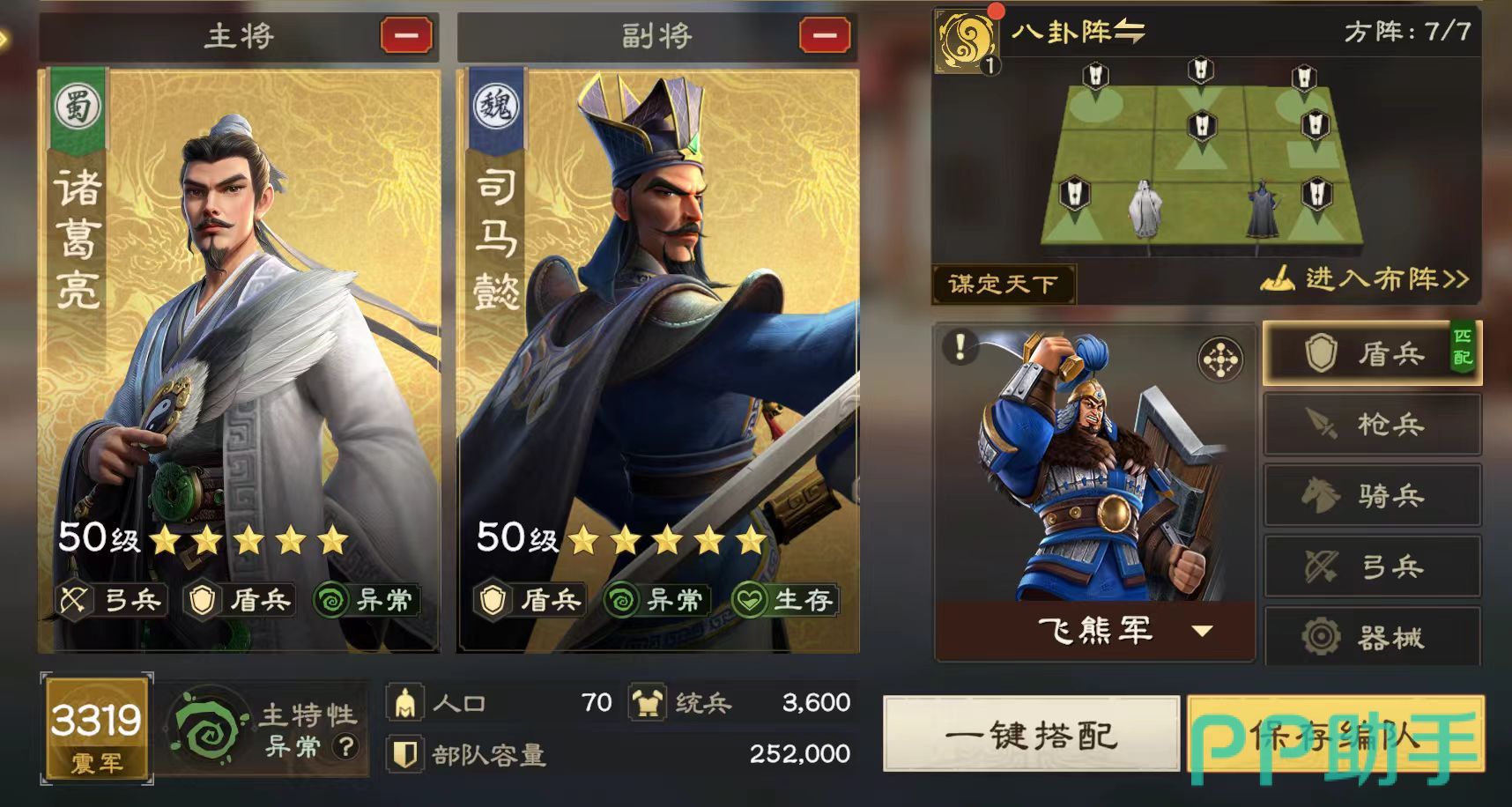 另一种主流选择是“异常状态流盾兵队”,典型代表为诸葛亮与司马懿组合,兵种选择飞熊军,形成高智谋导向的异常伤害体系。该阵容可激活特定武将羁绊,提升异常状态造成的伤害效果,推荐使用八卦阵或鱼鳞阵增强控场能力。司马懿普攻可附加中毒,配合诸葛亮被动触发的灼烧效果,持续施加负面状态。两位武将谋略成长值优异,配合续航机制,在战力相近的情况下几乎可应对任何阵容挑战。