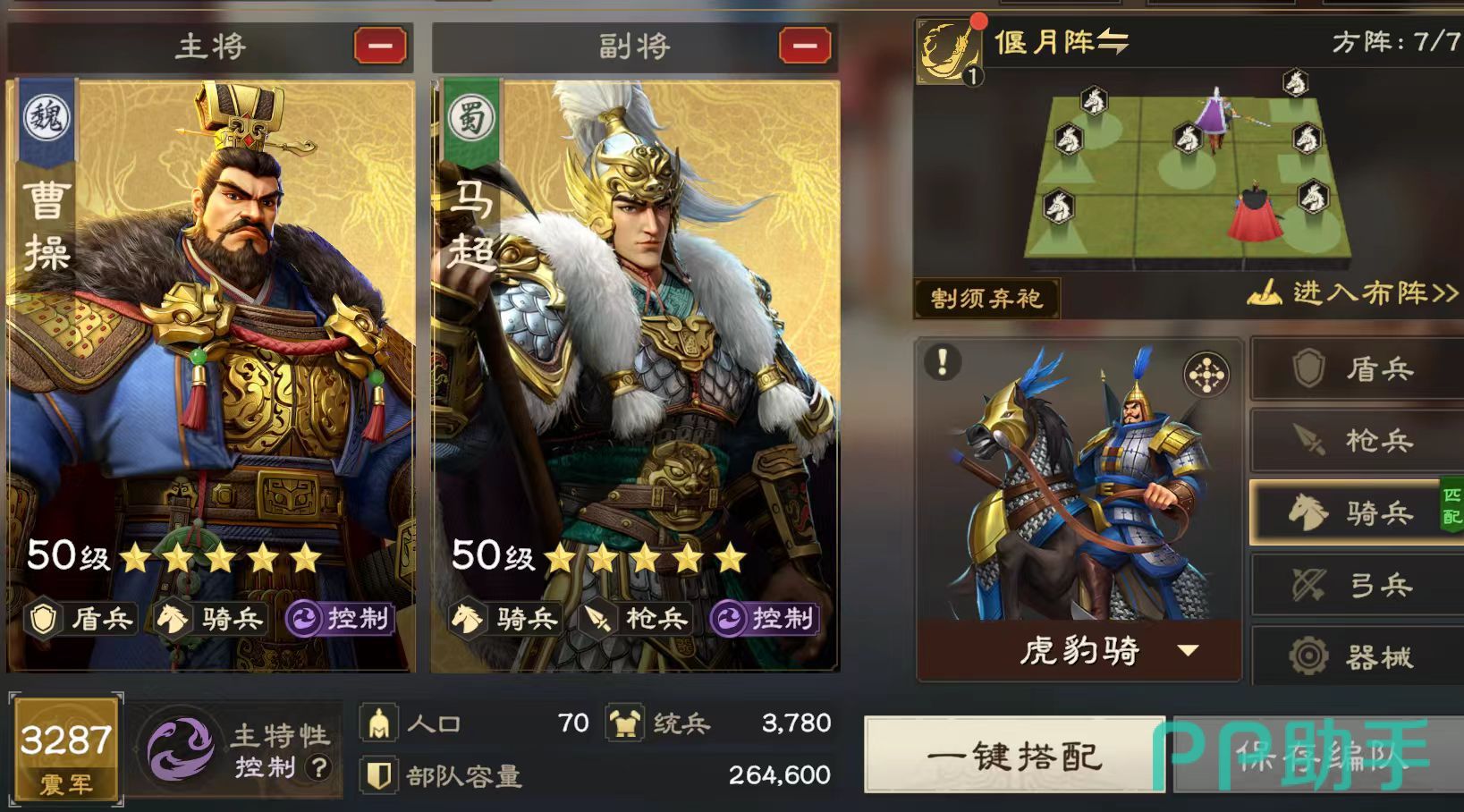 控制骑侧重于持久作战中的节奏掌控,通过叠加沉默、缴械、降怒等负面状态限制对手输出,逐步建立兵力优势。推荐使用曹操与马超搭配,激活“割须弃袍”羁绊后可提升统兵上限。兵种选择上建议配备虎豹骑,进一步延长控制链的持续时间。马超凭借技能提供稳定的沉默与怒气削减效果,曹操则强化缴械与异常状态附加能力,两者协同可实现多段控制衔接。需要注意的是,该体系依赖较高的技能等级,只有提升关键控制技能的等级,才能确保状态命中率稳定,发挥最大效能。