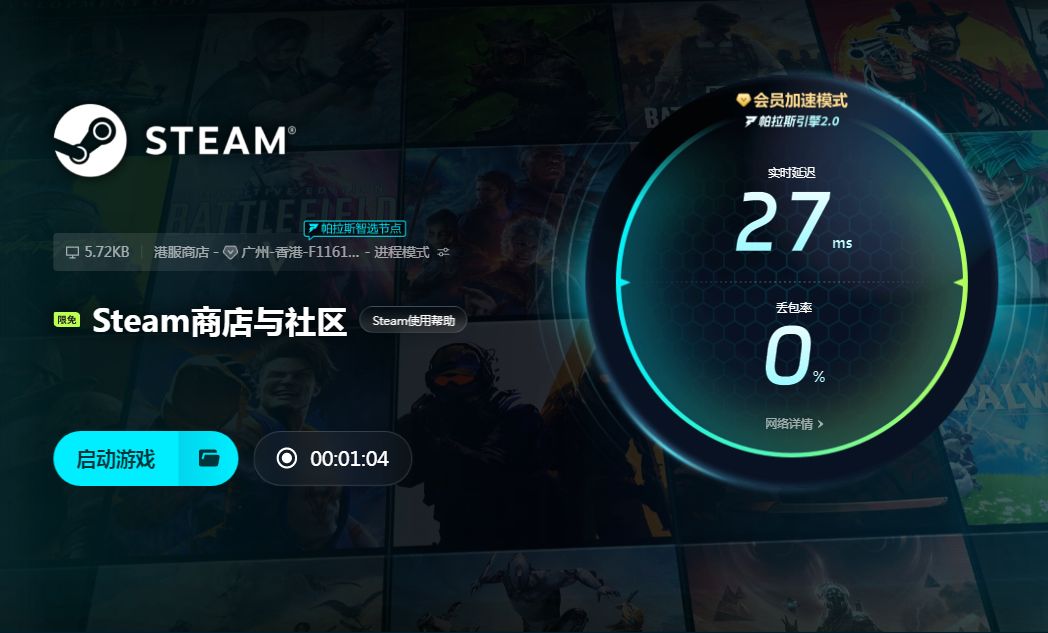 开启加速功能十分便捷。用户登录后,在搜索栏中输入目标游戏名称,点击一键加速即可完成设置。系统将自动进入智能加速模式,加速成功后可实时查看当前的连接状态,包括加速时长、延迟值、丢包率及加速效率等关键指标,全面掌握网络优化情况。