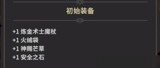 炼金术士的初始装备还是很多的,一共有4个装备,分别是火绒袋、安全之石、神赐芒草、炼金术士魔杖,总体来说这个角色的强度不错并且它的整体属性都比较偏高,在智力方面尤为突出,并且炼金术士是在单走的时候可以依靠石碑和冥想将自己的专注提升的,能够在一个回合就走出很多步,烟雾逃跑也有一定的辅助效果让炼金术士不怕暗杀,所以在探图方面单走是一个非常优势的角色,整体属性中的速度也还不错,可以说对比其他角色玩法要更多变,但是也比较依赖运气。