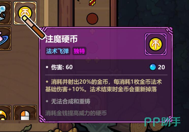 驻魔硬币(基础伤害60,攻击时弹幕变为金币弹幕,每次点击消耗20%金币,每枚金币提供+10%基础伤害):此法术是普攻流派的终极追求目标。需在第二关利用具有爆炸效果的法杖破坏雕像,小概率掉落。实际运用中需结合金币翻倍道具与生命换金币药水,形成持续资源循环。搭配贪婪戒指后可实现近乎无限的弹药供给,成型后成为全游戏最畅快的build之一。